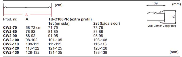Påbyggnadsprofil TB-C100PR finns för att öka mått (tillval), dvs. en extra profil (på ena sidan) ger 3 cm extra spel, och två profiler (en på vardera sida) ger ett spel på 3+3 cm på vardera sida.