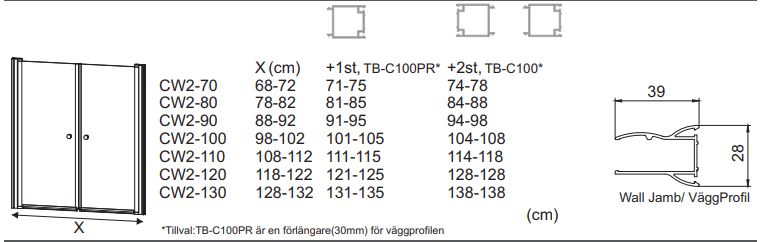 CABINEX duschdörr (CW1) monteras mellan 2 väggar. Produkten består av en dörr och en magnetlist. Finns i mått från 38 cm till 110 cm.