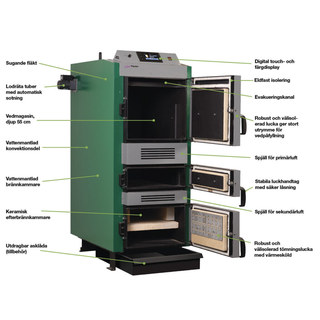 Calmarpannan V32/V40 är två nya vedpannor i Calmarpannan serien. Utvecklade för att uppfylla de nya Europakraven EN 303-5:2012 (klass 5) och Eco Design. Här laddar du pannan full, tänder veden genom den externa luckan på mitten.
