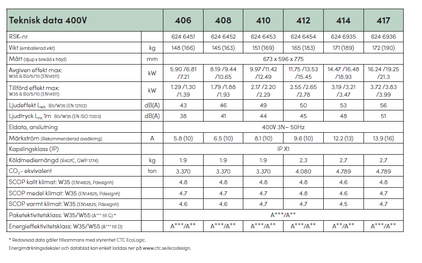 CTC EcoPart 400 är en högeffektiv värmepump med samma prestanda som CTC EcoHeat 400 men utan styrning och varmvattenberedning.