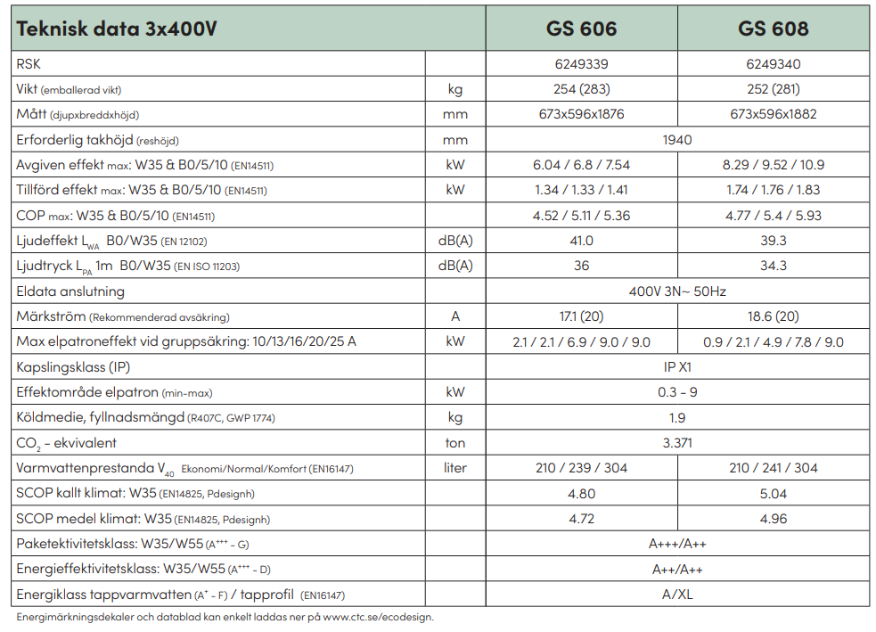 CTC GS 600 finns i två storlekar, 6 respektive 8 kW och har en varmvattenkapacitet på hela 300 liter. För lägsta energiförbrukning är de även utrustade med A-klassade lågenergicirkulationspumpar och en mycket effektiv isolering.