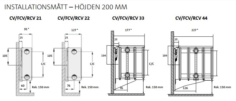 C/C = Radiatorns höjd minus 50 mm